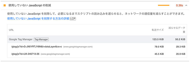 사용하지 않는 자바스크립트 감소외부 서버의 JavaScript를 사용하고 있다는 지적입니다. 해당 부분은 Google 애널리틱스의 측정 태그입니다. Google 서비스를 사용하면 PageSpeed Insights에서 감점이 된다는 것은 아이러니합니다.