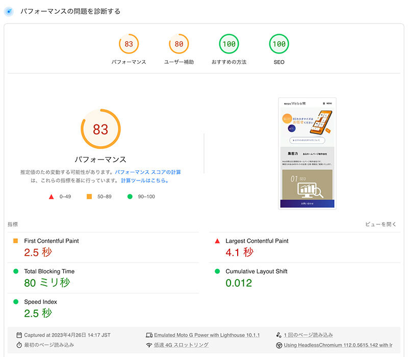 이번, 실례를 바탕으로 해설합니다. 타사 사이트는 무엇이므로, 당 기업 사이트를 예로 합니다. 우선, 2023/04/26 14:17:50 현재의 톱 페이지의 PageSpeed Insights의 점수는 이쪽입니다.