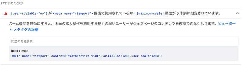 [user-scalable="no"] 가 요소에서 사용 중이거나 [maximum-scale] 속성이 5 미만으로 지정되었습니다.META 태그의 viewport 지정에 대한 지적이므로 수정했습니다.