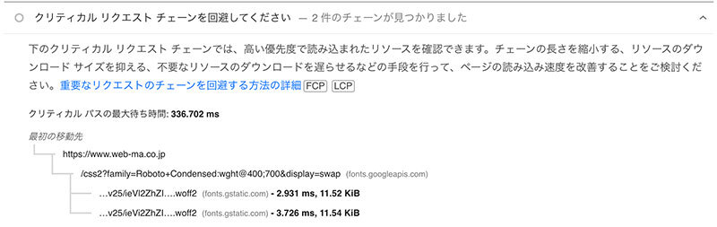 중요한 요청 체인을 피하십시오.Google 웹 글꼴 사용에 대한 지적입니다. Google 웹 글꼴을 사용하면 상당한 점수가 감소합니다. PageSpeed Insights를 중시하는 경우 사용을 삼가하는 것이 좋습니다.