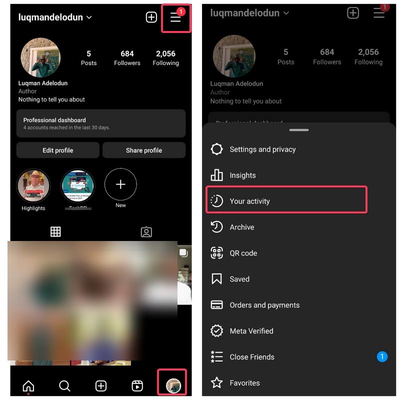 2. 프로필 오른쪽 상단 모서리에 있는 3줄 메뉴를 클릭한 다음 내 활동을 선택합니다.