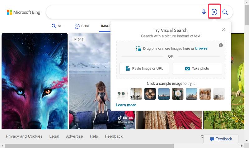 Bing 이미지 검색은 Google 이미지 검색과 유사하게 작동하지만 Google의 강력한 데이터베이스가 없습니다. Instagram 콘텐츠를 검색할 때 이미지를 기반으로 일치 항목을 찾는 데 유용할 수 있습니다. 또한 Bing Image Search를 활용하는 과정은 Google과 유사합니다. 장치에서 Bing 이미지 검색을 열고 검색을 위해 원하는 이미지를 업로드하고 검색 버튼을 누르기만 하면 됩니다.