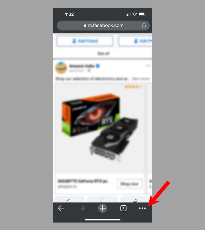 4. Facebook 홈 페이지(또는 타임라인 페이지)에 있으면 브라우저의 하단 주소 표시줄에 있는 세 개의 점이 있는 버튼을 누릅니다.