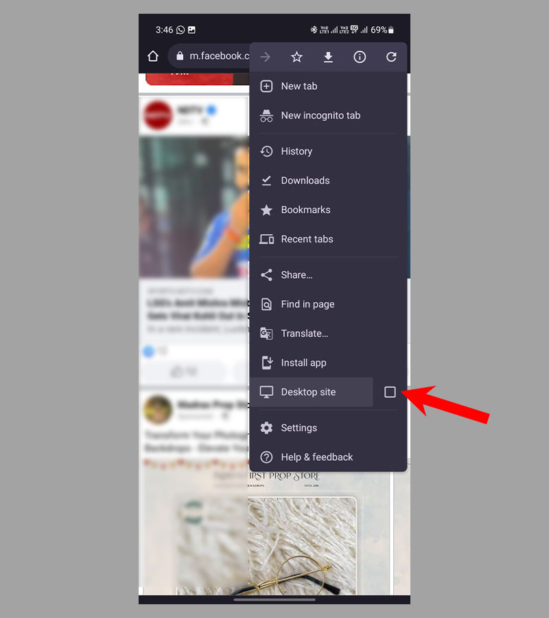 5. 다음으로 새로 열린 메뉴에서 ' 데스크톱 사이트 ' 옵션을 선택하여 Facebook 데스크톱 사이트의 모바일 버전으로 전환합니다.