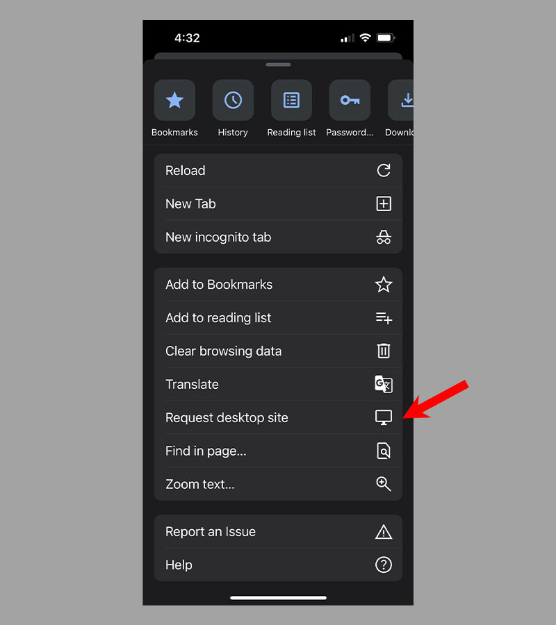 5. 더 아래로 스크롤하여 새로 열린 메뉴에서 '데스크톱 사이트 요청' 옵션을 선택하여 Facebook 데스크톱 사이트의 모바일 버전으로 전환합니다.
