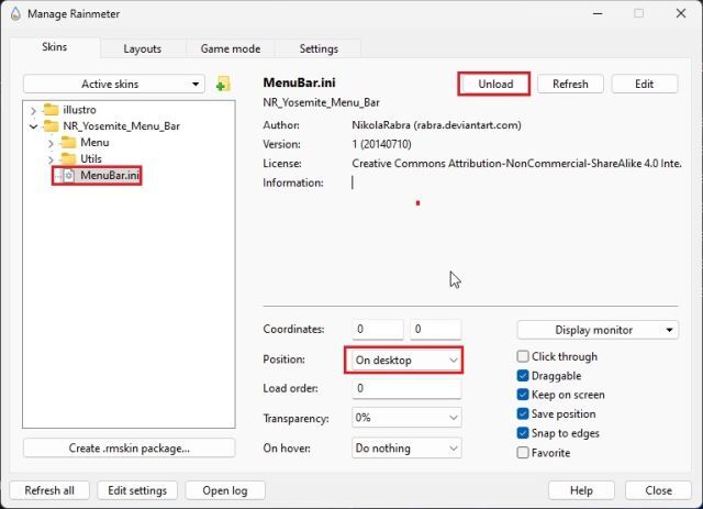 7. 그런 다음 Rainmeter를 열고 "NR_Yosemite_Menu_Bar"를 확장하고 " Menubar.ini "를 선택합니다. 하단에서 "Position"을 "Normal"로 변경합니다. 마지막으로 "로드"를 클릭하십시오. 이렇게 하면 macOS 메뉴 모음이 Windows에 추가됩니다.