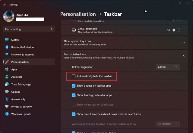 17. 여기에서 " 자동으로 작업 표시줄 숨기기 "를 활성화하여 숨깁니다.