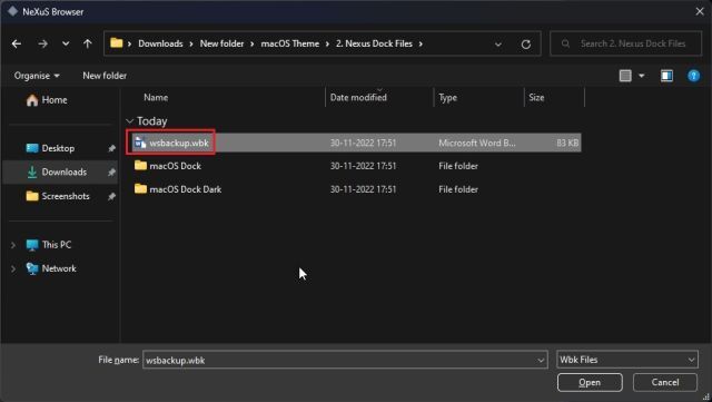 14. 그런 다음 "macOS Theme" 폴더를 열고 "Nexus Dock Files"로 이동합니다. 여기에서 " wsbackup.wbk " 파일을 선택하고 "열기"를 클릭합니다.