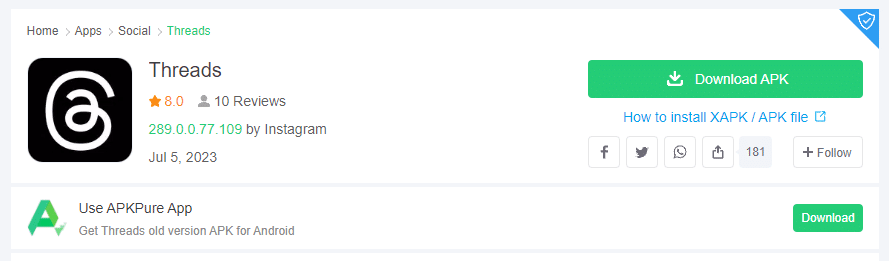 APKPure와 같은 웹사이트에서 Threads APK를 사이드로드할 수도 있습니다.