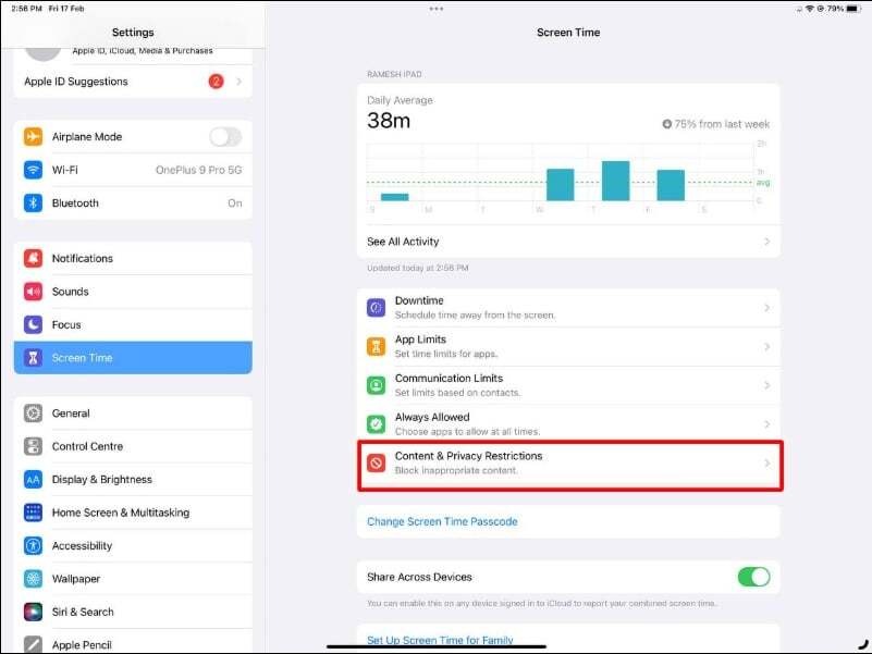 - 화면 시간을 누른 다음 콘텐츠 및 개인 정보 보호 제한을 누릅니다.