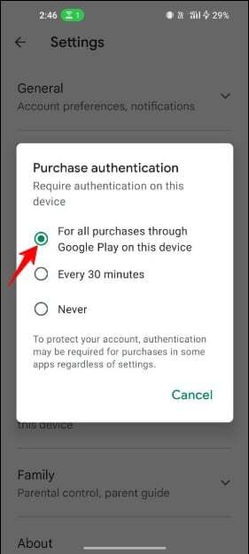 - 그런 다음 옵션 목록에서 이 기기의 모든 Google Play 구매에 대해를 선택합니다.