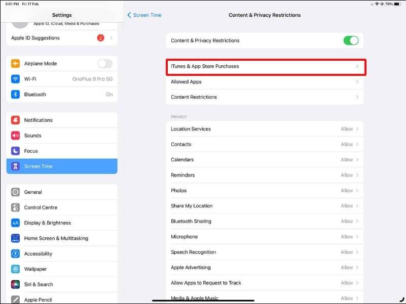 - "iTunes 및 App Store 구매"로 이동하여 "콘텐츠 및 개인정보 보호 제한" 버튼이 활성화되어 있는지 확인하십시오. " iTunes 및 App Store 구매 "를 누릅니다.