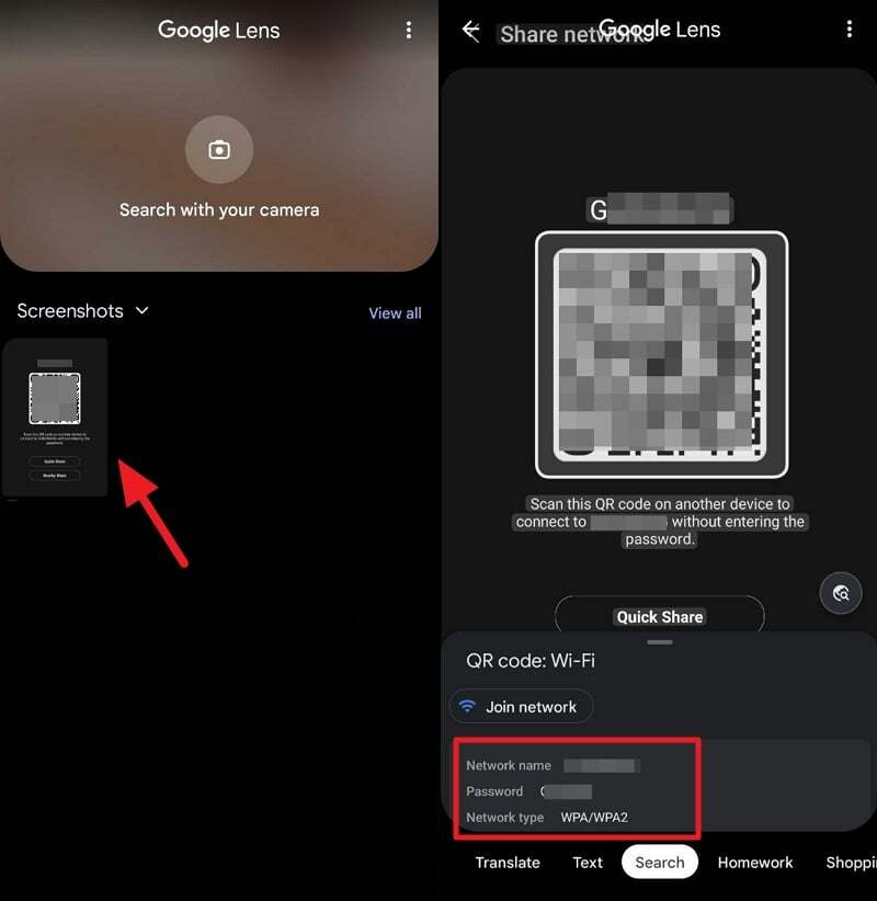 이 방법은 위 방법의 연속입니다. 설정 앱에 표시되는 QR 코드를 사용하고 Google 렌즈로 스캔합니다. 절차를 시작하기 전에 Wi-Fi 설정에 표시되는 QR 코드의 스크린샷을 찍으십시오.