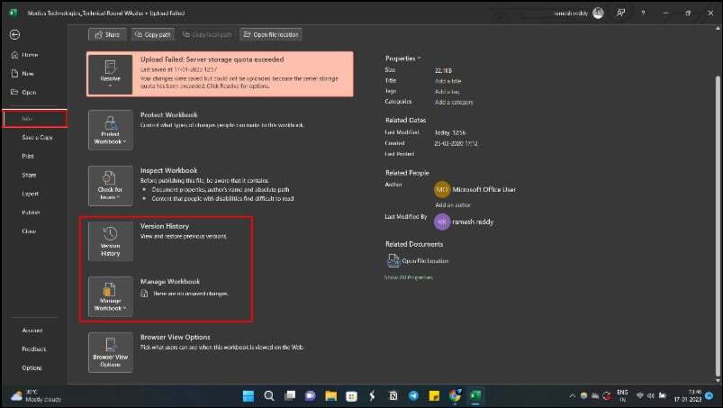 - 2단계: " 파일 " 옵션을 클릭한 다음 " 정보 "를 클릭합니다. 온라인에 저장된 동일한 파일의 이전 버전을 보려면 버전 기록을 선택할 수 있습니다.