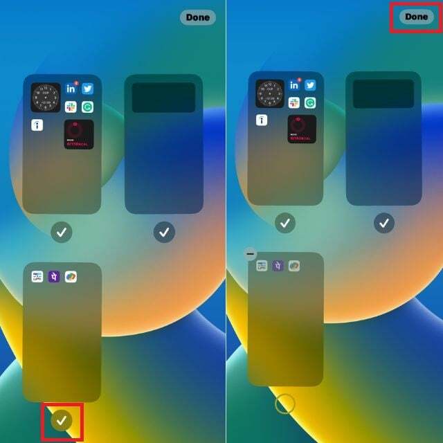 - 확대된 버전의 홈 화면 하단에 있는 확인란을 선택 취소합니다. 원의 체크를 해제하면 숨기고 싶은 홈 화면이 살짝 어두워집니다. 이제 홈 화면이 숨겨졌음을 나타냅니다.