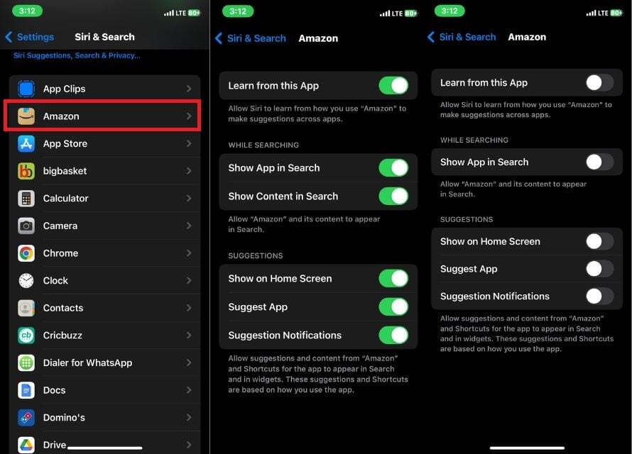 - 특정 앱이 Siri 및 검색 제안에 표시되지 않도록 하려면 토글을 선택 해제하십시오.
