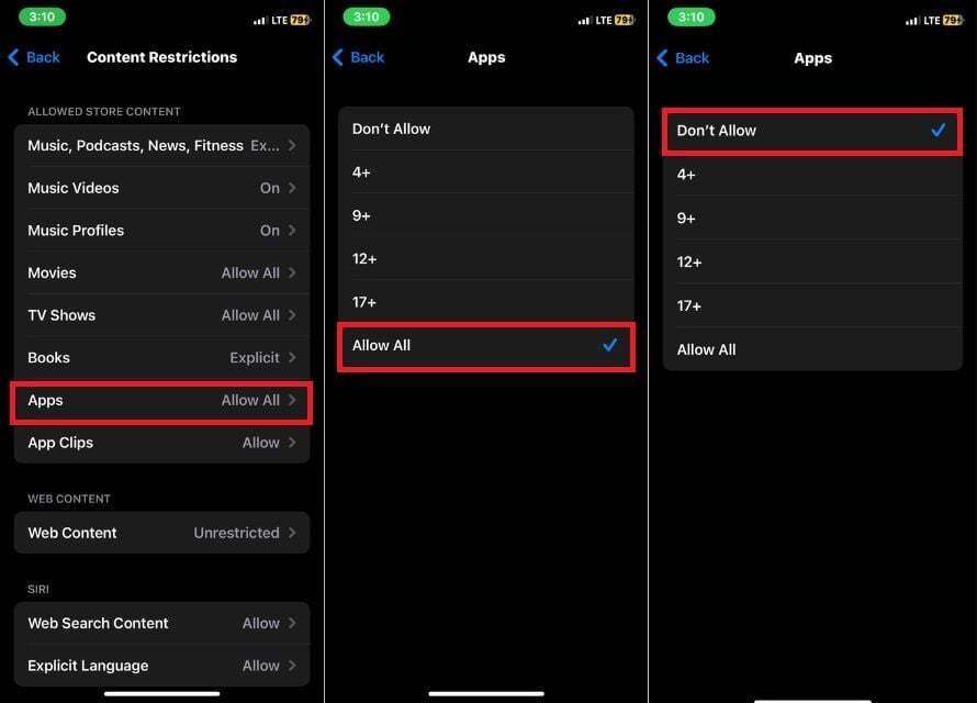 - 앱을 숨기려는 연령대의 옵션을 클릭하거나 일부 중요한 기본 제공 앱을 제외한 모든 앱을 완전히 숨기려면 허용 안 함을 클릭합니다.