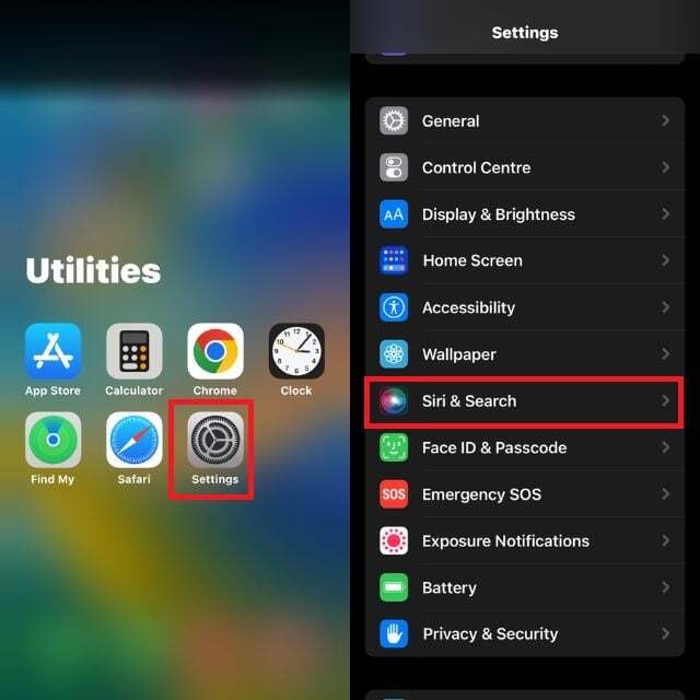설정에서 Siri 및 검색을 사용하여 앱 숨기기