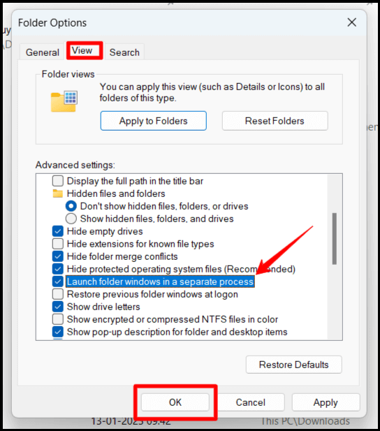 - 2단계: 이제 " 보기 "를 클릭한 다음 " 고급 설정 " 아래로 스크롤합니다. 이제 " 별도의 프로세스에서 폴더 창 시작 " 확인란을 클릭합니다.