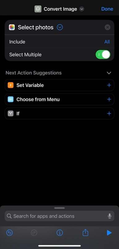 - 검색 표시줄을 클릭하고 사진 선택 작업을 검색한 다음 탭하여 바로가기에 추가합니다. 작업을 다시 클릭하고 다중 선택 옵션을 켭니다.