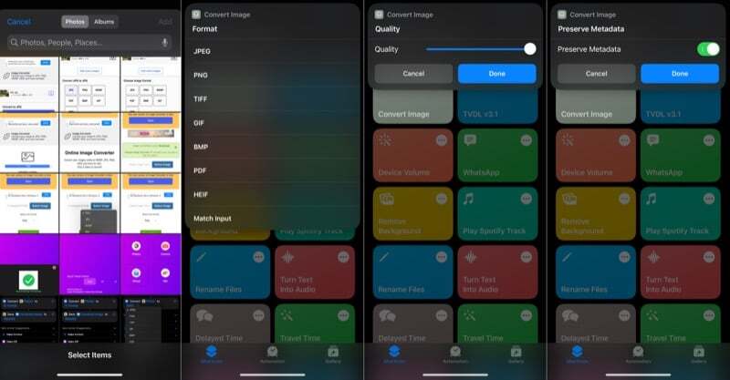 이제 이미지를 변환하고 싶을 때마다 이미지를 열고 공유 를 누른 다음 공유 메뉴 에서 방금 만든 바로 가기를 선택하십시오 바로 가기는 대상 이미지 형식을 선택하라는 메시지를 표시합니다. 하나를 선택하고 품질을 조정하라는 메시지가 표시되면 슬라이더를 사용하여 이미지 품질을 설정합니다. 다음으로 메타데이터를 보존할지 또는 제거할지 묻는 메시지가 표시됩니다. 옵션을 적절하게 선택하면 바로 가기가 이미지를 변환합니다.