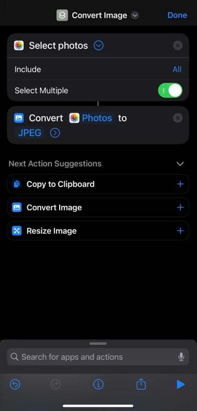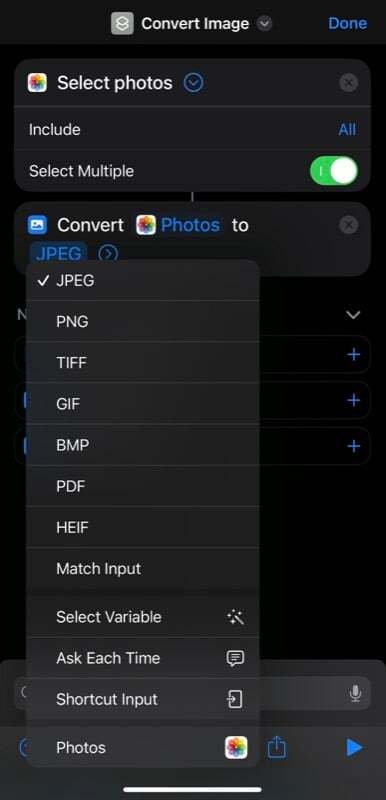 - 이미지 변환 작업 에서 JPEG를 탭 하고 메뉴에서 매번 묻기 옵션을 선택합니다 이렇게 하면 바로 가기가 동적으로 만들어지고 실행할 때마다 출력 형식을 결정할 수 있습니다.