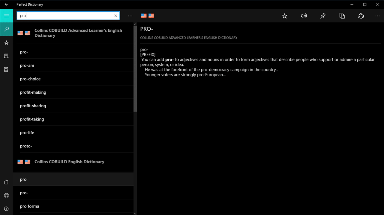 이 사전은 검색창에 단어를 입력하는 동안 단어를 제안합니다. 단어를 즐겨찾기로 고정하고 즐겨찾기 섹션에서 볼 수도 있습니다. 이 앱은 검색 중인 단어의 오디오 발음도 재생합니다.