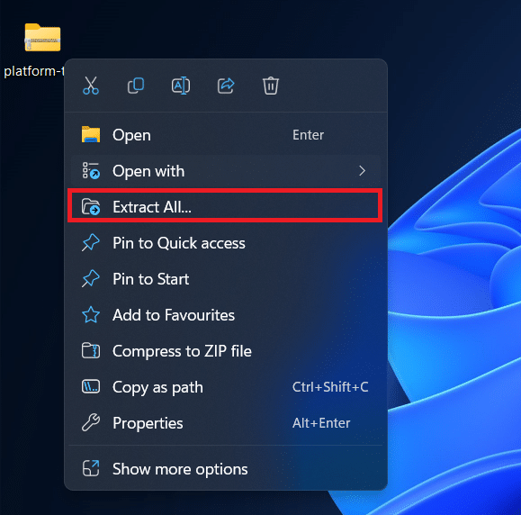 - 다운로드한 파일은 ZIP 파일이므로 압축을 풀어야 합니다. 파일을 마우스 오른쪽 버튼으로 클릭한 다음 모두 추출을 클릭합니다 .