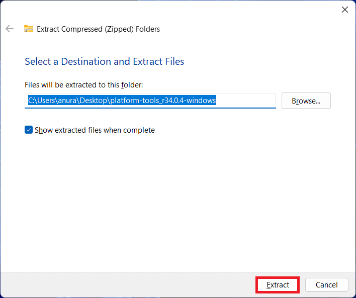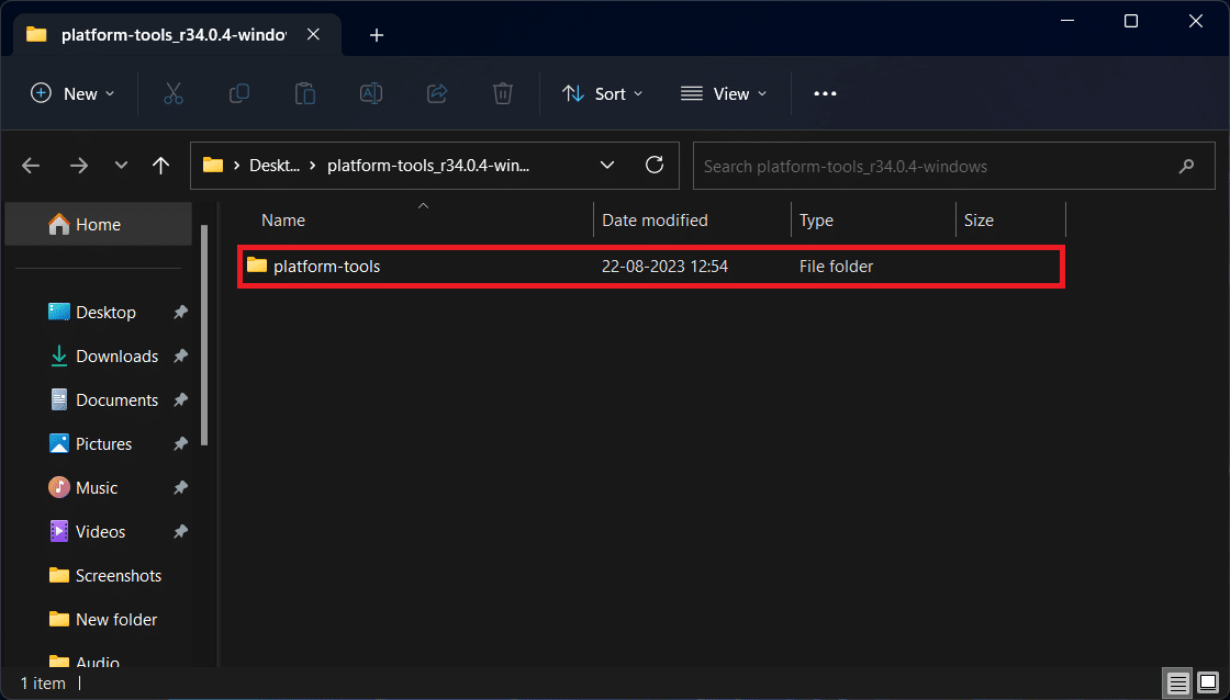 - 파일을 추출한 후 platform-tools 폴더를 두 번 클릭하여 엽니다. 미리 필요하므로 폴더를 닫지 마십시오.