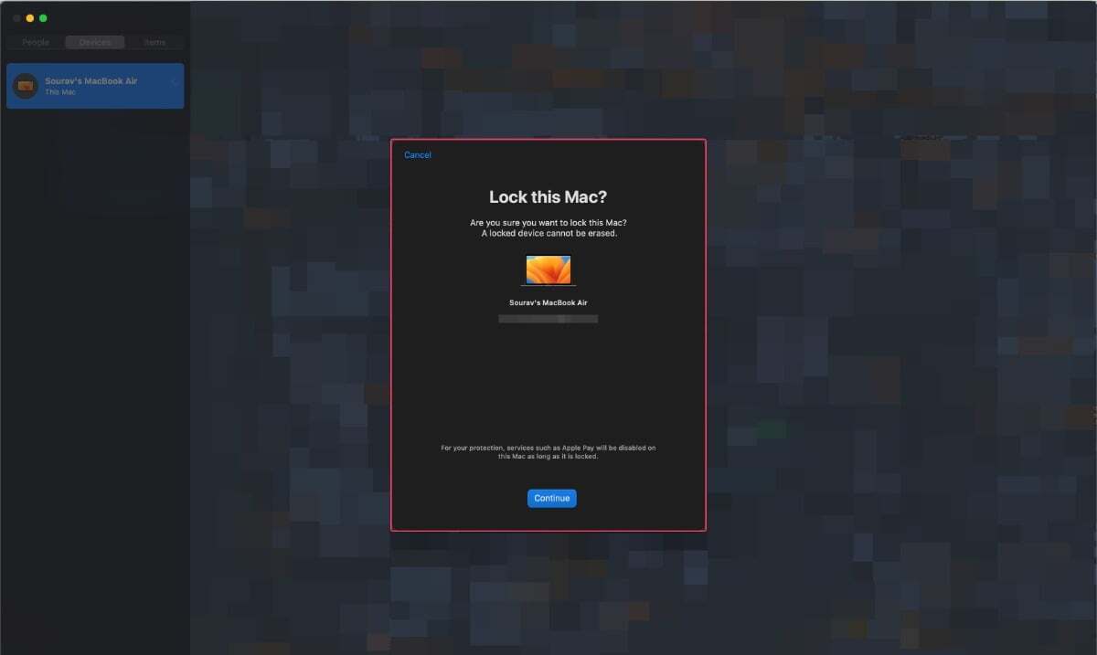 나의 찾기로 Mac을 찾을 수 없는 경우 Mac을 분실로 표시할 수 있습니다. 이는 Apple Pay를 금지하며, Mac을 발견한 사람이 귀하에게 연락할 수 있도록 사용자 정의 메시지를 표시하도록 Mac을 설정할 수도 있습니다. 기기를 분실로 표시하는 방법은 다음과 같습니다.