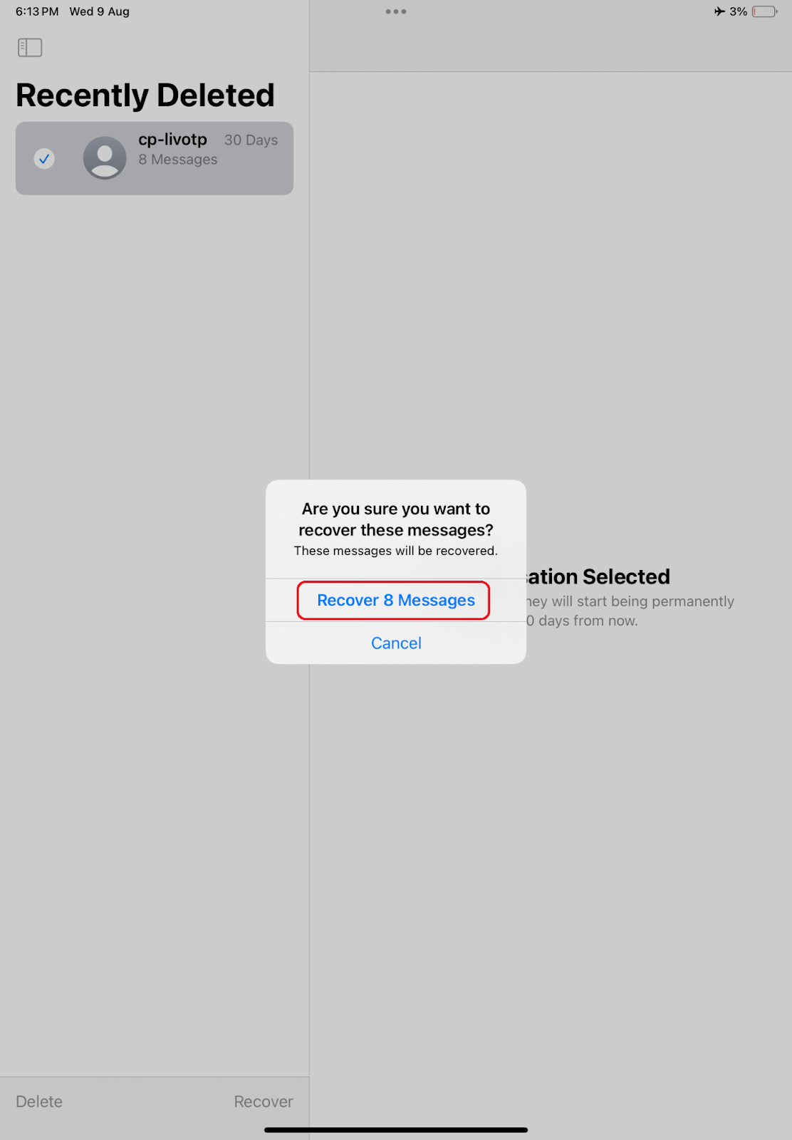 - 복구를 클릭하면 확인 팝업이 나타납니다. X 메시지 복구 를 탭합니다