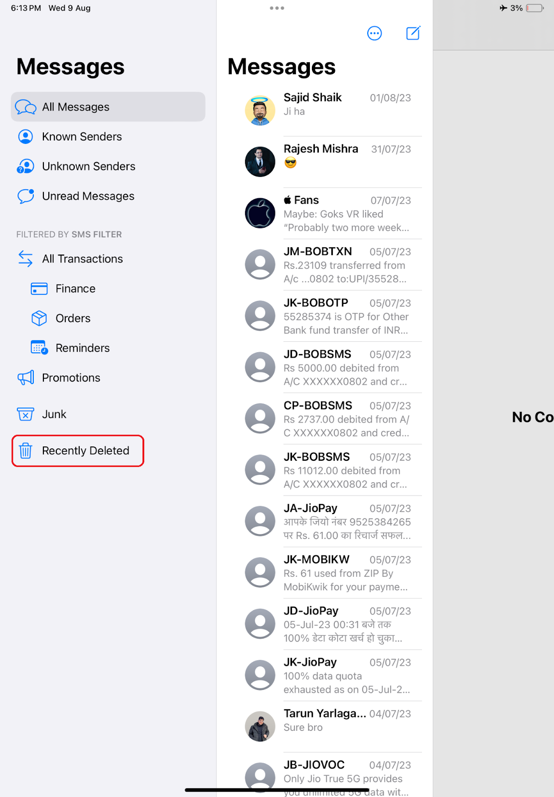 - 최근 삭제된 항목 옵션을 선택하세요 삭제된 모든 메시지 목록이 표시됩니다.