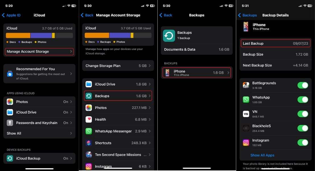iPhone에서 모든 문자 메시지를 삭제한 지 30일이 넘었거나 기기가 iOS 16과 호환되지 않는 경우 이러한 경우에는 iCloud 백업이 해결 방법입니다. 메시지를 삭제하기 전에 iCloud 백업을 생성했는지 확인하면 소중한 대화를 쉽게 복구할 수 있습니다.