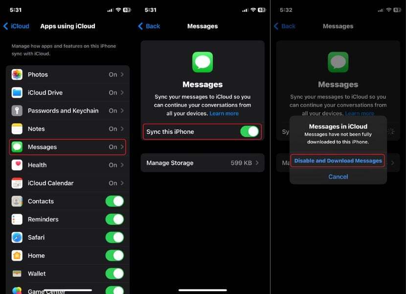 - 메시지가 표시되면 메시지 비활성화 및 로드를 선택합니다 그러면 iCloud에서 iPhone으로 문자 메시지 다운로드가 시작됩니다.