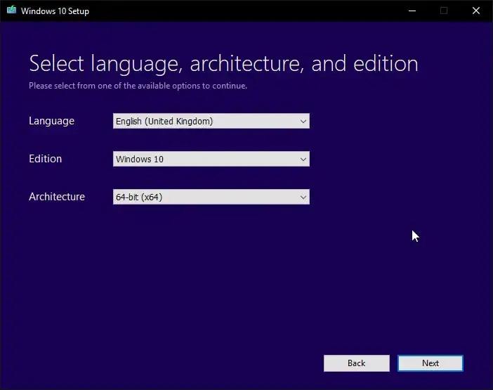 - 이제 Windows의 언어, 버전 및 아키텍처를 선택하라는 메시지가 표시됩니다 따라서 요구 사항에 따라 선택하십시오.