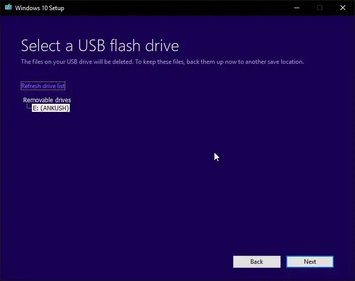 - 도구를 실행하자마자 USB 플래시 드라이브가 자동으로 감지됩니다. USB 플래시 드라이브가 여러 개 있는 경우 원하는 것을 선택하세요.