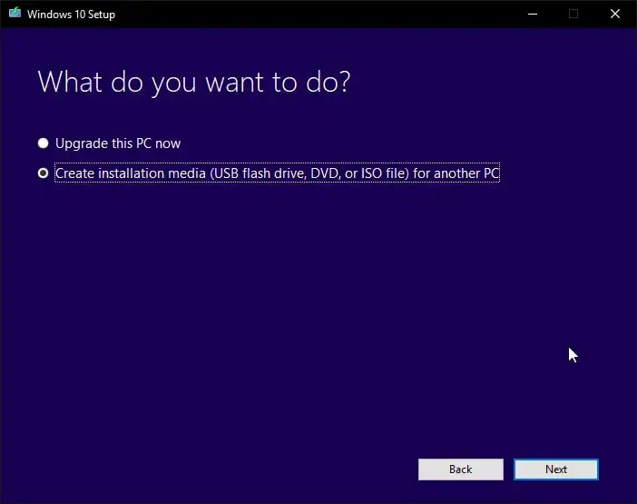 - 다음으로 " 다른 PC용 설치 미디어(USB 플래시 드라이브, DVD 또는 ISO 파일) 만들기 " 옵션을 선택하고 "다음"을 클릭 해야 합니다 . “