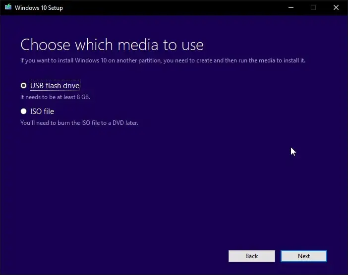 - " 다음 "을 클릭하여 진행하세요 이제 기본 미디어를 선택하라는 메시지가 표시됩니다. " USB 플래시 드라이브 "를 선택하고 USB 플래시 드라이브가 최소 8GB 스토리지 변형 인지 확인하세요