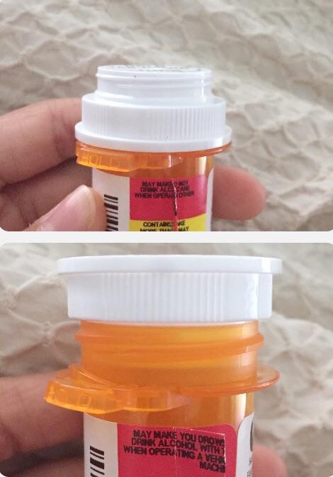 - 대부분의 처방약 병 뚜껑은 거꾸로 뒤집고 나사로 조여 어린이에게 안전하지 않게 만들 수 있습니다(예: 이미지 참조).