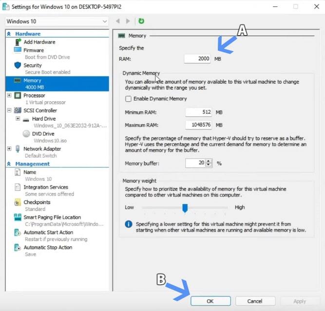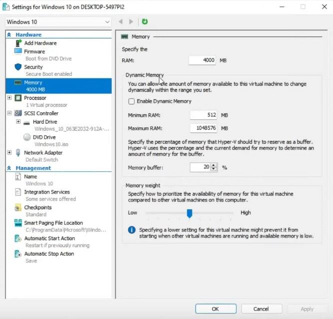 그런 다음 동적 메모리 하위 섹션에서 동적 메모리 활성화가 선택되어 있으면 선택을 취소합니다 그런 다음 확인을 클릭하여 설정을 저장합니다.