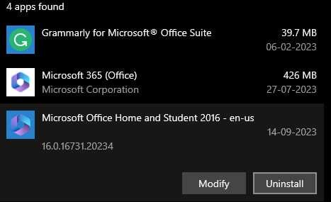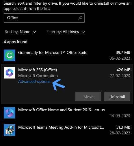 재설정하면 MS Office에서 실패한 제품 활성화 문제를 해결하는 데 도움이 되는 경우가 많습니다. 앱 제거 섹션으로 이동하여 이를 수행하는 방법은 다음과 같습니다.