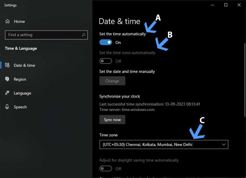 시간대 옵션이 회색으로 표시되면 C로 표시된 대로 아래 옵션에서 수동으로 설정할 수 있습니다.