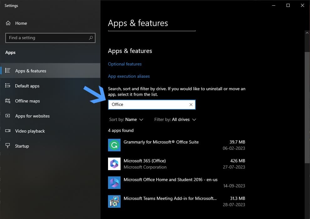 1. 이전 섹션과 마찬가지로 앱 제거 섹션으로 이동하여 Office를 검색합니다
