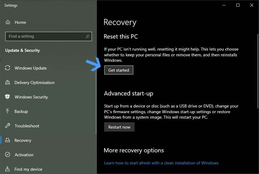 2. 그런 다음 이 PC 재설정 섹션에서 시작하기를 선택합니다.