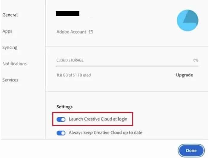 4. 설정을 클릭한 다음 로그인 시 Creative Cloud 시작 슬라이더를 끕니다.