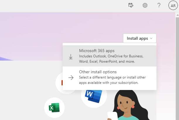 13. 오른쪽 상단의 앱 설치 버튼에서 Microsoft 365 앱을 선택합니다.