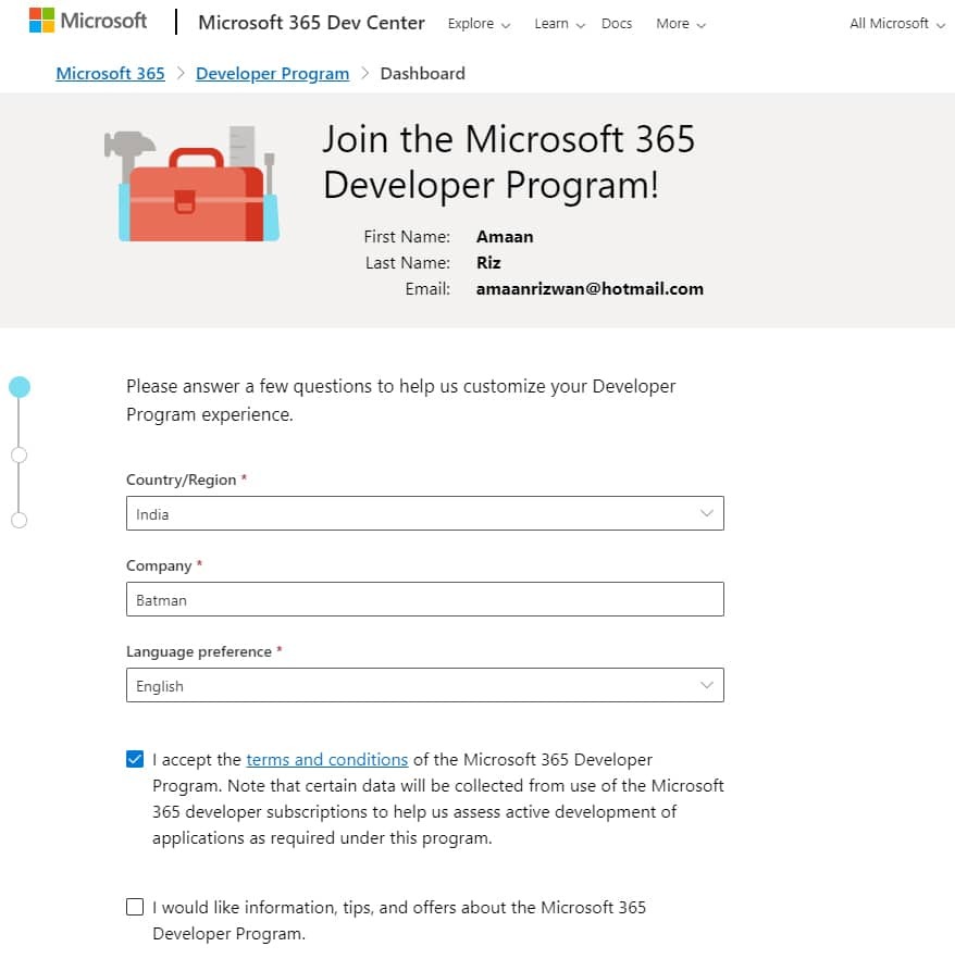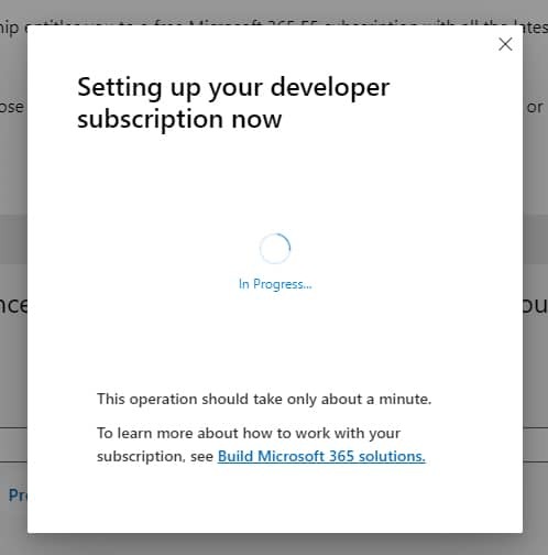 10. 그러면 Microsoft에서 개발자 계정을 설정하는 데 몇 초가 걸리며 Microsoft 365를 무료로 다운로드할 수 있습니다.