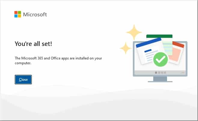16. 이제 완료 메시지가 표시됩니다. 닫기를 클릭한 다음 Microsoft 365 앱 중 하나를 엽니다.