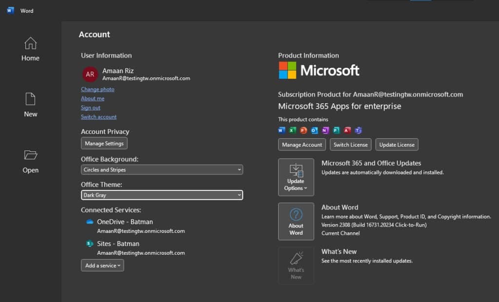 18. Word, PowerPoint 등과 같은 Office 365의 앱을 연 다음 계정 섹션으로 이동합니다. 로그인하라는 메시지가 표시되면 무료 Microsoft 365 라이선스가 표시됩니다.
