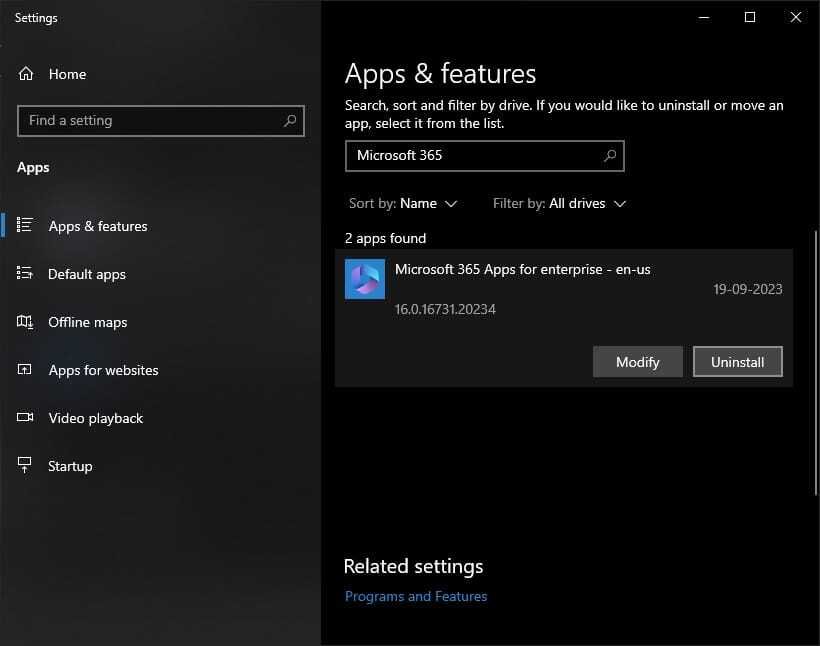 2. Microsoft 365를 검색한 후 버튼을 통해 제거하세요.